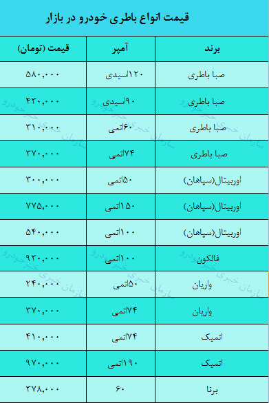 به گزارش خبرخودرو، قیمت روز انواع باطری خودرو در بازار 14 اردیبهشت 98 را می‌توانید در جدول زیر ببینید: