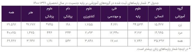 شمار پارساهای زنان در گروههای آموزشی علوم پایه با چهار هزار و ۵۳۴ مدرک، علومپزشکی با ۷۴۵ مدرک، و هنر با دو هزار و ۲۷۲ مدرک از پارساهای مردان بیشتر است. شمار پارساهای مردان در دیگر گروههای آموزشی از پارساهای زنان بیشتر است.