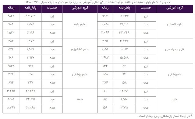 شمار پایاننامههای زنان در گروه آموزشی علوم پایه با سه هزار و ۷۱۲ مدرک، علومپزشکی با ۱۷۷ مدرک، و گروه هنر با دو هزار و ۲۰۱ مدرک از پایاننامههای مردان بیشتر است. رسالههای زنان نیز در گروه آموزشی علوم پایه با ۸۲۲ مدرک و علومپزشکی با ۵۶۸ مدرک بیشتر از رسالههای مردان بوده است.