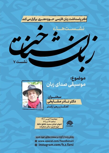 به گزارش ایسنا، نشستهای «زبان شناخت» این بار با موضوع «موسیقی صدای زبان» و با سخنرانی نادر مشایخی ـ آهنگساز و رهبر ارکستر ـ از طرف دفتر پاسداشت زبان فارسی حوزه هنری دوشنبه، ششم تیر ساعت ۱۴ تا ۱۶ در حوزه هنری سالن «صفارزاده» برگزار میشود.